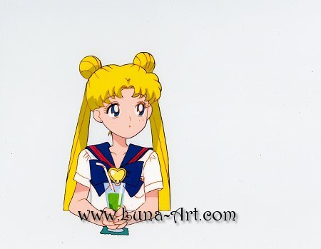 Usagi enjoying a green soft drink at the Crown dessert parlor. This cel holds a special place in my collection since it is one of my first two cels.