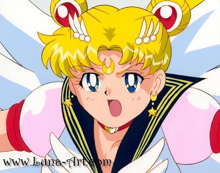 Eternal Sailor Moon performing her Silver Moon Crystal Power Kiss! attack.