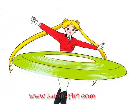 Usagi has joined a princess seminar held at the Rose mansion. Here, Usagi is dressed in a Rose uniform practicing throwing a frisbee. She scares the other girls when she throws it just like she throws her tiara in her Moon Tiara Action attack.