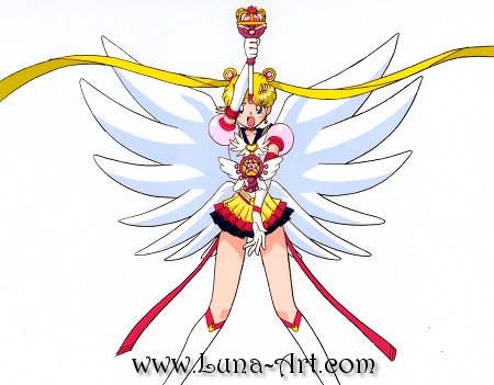 A nearly full body shot of Eternal Sailor Moon performing her Silver Moon Crystal Power Kiss! Attack. She is holding the Eternal Tier as it transforms into the Moon Power Tier.