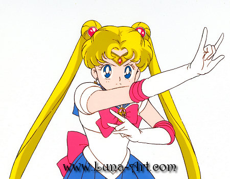 "In the name of the moon . . .I will punish you!" A bank cel from Sailor Moon's introduction speech during the R series. This cel was only used during some of the R series episodes, usually when she says something other than her ordinary speech.