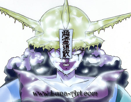 Sailor Mars, Sailor Mercury and Sailor Moon gang up on the cardian, Pipieero. First, Mars hits her with one of her anti-evil signs. Then Mercury follows up with her Shabon Spray Freezing attack which covers the monster in ice. Finally, Sailor Moon attacks with her Moon Princess Elimination! After Sailor Moon's attack, the screen goes back and forth between these two cels (see next cel) multiple times before the monster disentegrates.