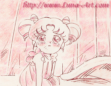 Chibi Usa is upset and embarrassed after she wets her bed while sleeping with Usagi. She remembers back to a time when she was younger. Chibi Usa is sitting alone on her bed, crying and embarrassed because she has wet the bed. Her mother, Neo-Queen Serenity, appears at her bedside and Chibi Usa looks up in surprise with tears in her eyes.