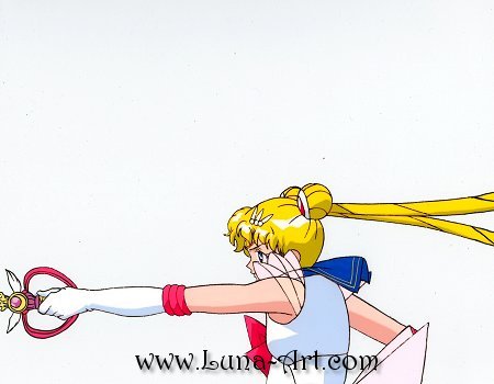 Super Sailor Moon attacks the Monster-of-the-Day with her new Kaleido-moon-scope. This attack cel is only used in the first two episodes of the SuperS series.