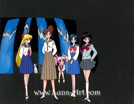 Minako, Makoto, Ami and Rei in their junior high fukus with ChibiUsa holding Diana, Luna and Artemis. They are standing in front of a fountain (the odd blue water behind them) as Usagi runs up to them. This cel come from the SEGA Saturn game: Bishoujo Senshi Sailor Moon Super S: Various Emotion. A big "Thank You!!" to all the people that emailed me to let me know my cel could be found in a clip on YouTube.