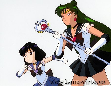 Sailor Saturn and Sailor Pluto running with the other Senshi towards Mamoru's apartment once they realize that he has been trapped by Queen Nehelenia's evil curse. Incredibly rare shot I was lucky to find!