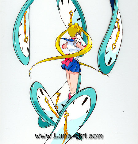 Sailor Moon appears surrounded by clocks. Another bank cel that comes from the second half of R series opening animation.