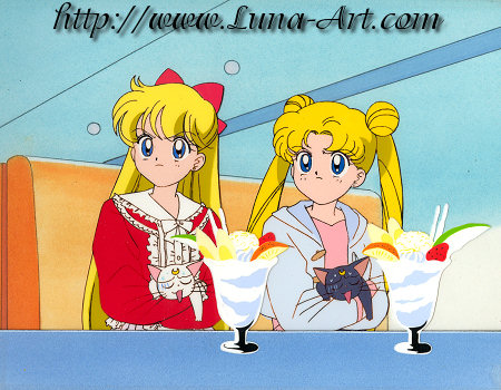 Minako and Usagi sit in a booth at the Crown fruit parlor. Luna and Artemis are dazed after the girls have squished them for criticizing their attempt to patch things between Motoki and his girlfriend Reika. Ami reminds them that they should be concentrating on the enemy instead of romance problems.