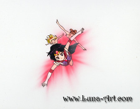 Another bank cel from the SuperS opening animation as the Sailor Senshi fly up after Pegasus. This one features Sailor Mars (just after her clothes appear), Sailor Jupiter and Sailor Venus.
