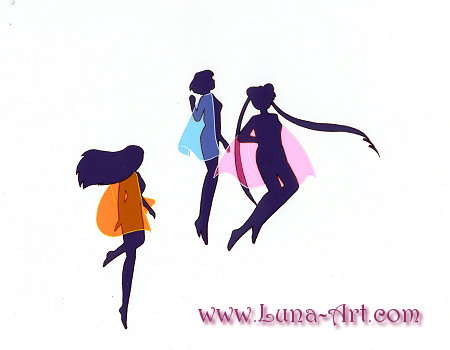 Sailor Mars, Sailor Mercury and Sailor Moon twirl around in shadows with matching colored capes before they reveal their true identity. This comes from the opening animation from the first half of the original series. Interesting fact (at least to me ^_~): this segment in the opening was reanimated and is slightly different starting with episode #6. This cel comes from the second version of the sequence.