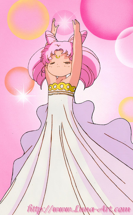 Chibi Usa starts to cry and her tears turn into the ginzuishou of the future. Chibi Usa realizes she has been carrying the second ginzuishou within her ever since it disappeared in her hands. She raises it high over her head and transforms into Small Lady, "Please, Silver Crystal, lend me the power to protect everyone!"