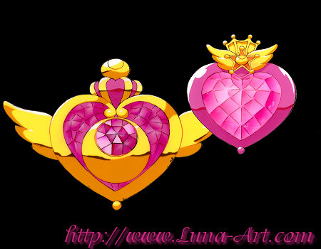 Moon Crisis! Make-up! Usagi's and Chibi Usa's brooches appear together and open up to reveal the two ginzuishous that allow their transformations into Super Sailor Moon and Super Sailor Chibi Moon.