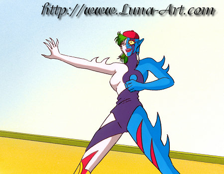 Feeling they are at a disadvantage fighting in a small art gallery, Sailor Neptune and Uranus run away. Daimon Chokokka flings off her cloak and gives chase.