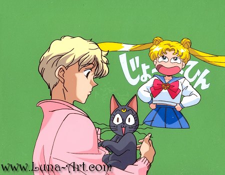 Kakeru guesses Luna's name and says, "Luna, that's a pretty fancy name. I bet your owner is a pretty sophisticated person." Luna then imagines her "sophisticated" owner. There is supposed to be a thought bubble around Usagi. The green background is matching for inside the thought bubble only. Tooo funny, I love it!!