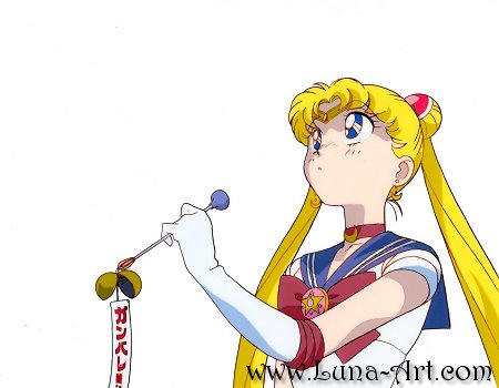 Sailor Moon yanks off the dart that Chibi Usa shot at her head to encourage her to continue to fight.