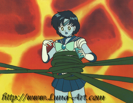 The DD Girls use an illusion of molten rock against Sailor Mercury. She surrounds herself with her Shabon Spray and uses it to protect her as the molten rock envelops her. As soon as she enters the rock, two of the DD Girls wrap her up in their vines.