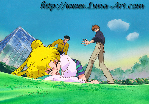 Usagi senses that Fiore is getting a little too familiar with Mamoru and tells him that Mamo-chan is her boyfriend. Fiore tells her to get out of the way and pushes her to the ground in front of a stunned Mamoru.