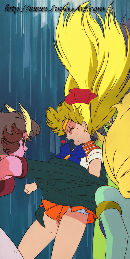 The remaining 3 DD Girls burst through the snow and capture Sailor Venus in their vines, pulling her beneath the snow. Knowing there is no escape, Sailor Venus performs her Crescent Beam attack at point blank, killing herself and one of the DD Girls.