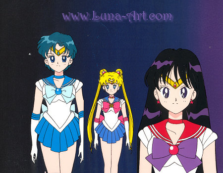 Sailor Mercury, Moon and Mars walking side-by-side in split screen. This is a OP bank cel from the first half of the original Sailor Moon series. While I like my other bank cel from this sequence, I have always been looking for a cel where they are walking forward and Mars isn't cut off.