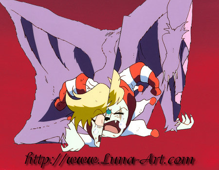 Jun-Jun's dream-eating lemure Tobikiri Yaro gets staged out by Super Sailor Moon.