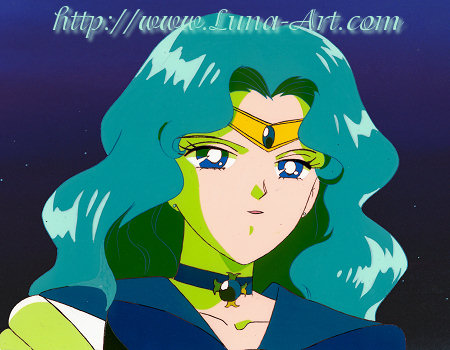 Each of the Sailor Senshi appear on screen as Sailor Moon spins in circles in the foreground. Sailor Neptune is the last Sailor Senshi to appear with her highlights of seafoam green. Bank cel from the opening sequence of the S series.