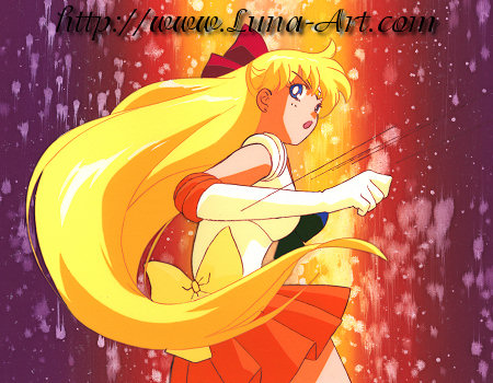 Each of the Sailor Senshi appear and perform a unique attack as Sailor Moon twirls around the screen. Sailor Venus spins around to reveal her starting to attack using her customary heart-linked chain. Bank cel from the S series opening animation. The outlines on Venus's hair are done in orange rather than the normal black. I found out later that a cel of Sailor Moon twirling from the OP that I bought several years earlier is the C-layer that matches this cel.