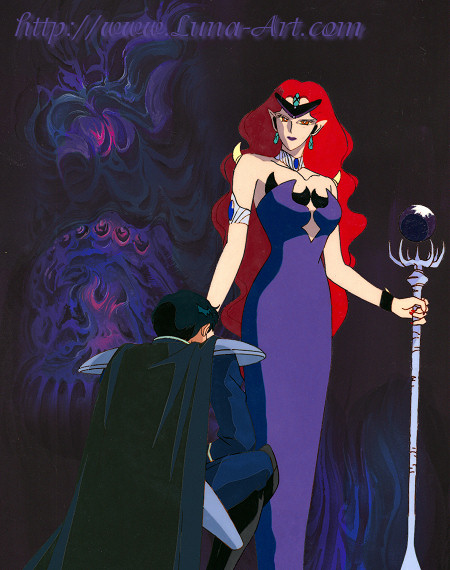Queen Beryl traps Sailor Moon using some sort of energy bubble and drops her on the floor of her stronghold. Sailor Moon hears a voice and looks up and sees Queen Beryl standing half in shadows before her. Queen Beryl introduces herself and then the shadows lift to show Endymion kneeling beside her, kissing her hand, much to Sailor Moon's horror.