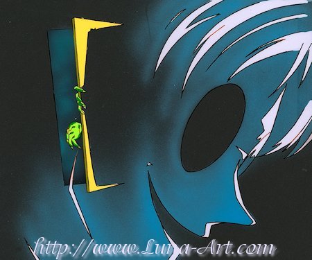Evil scientist Professor Tomoe is shown in his laboratory and then his profile appears; his face obscured by shadows. A door opens and green hands reach out. Bank cel from the opening sequence of the S series.