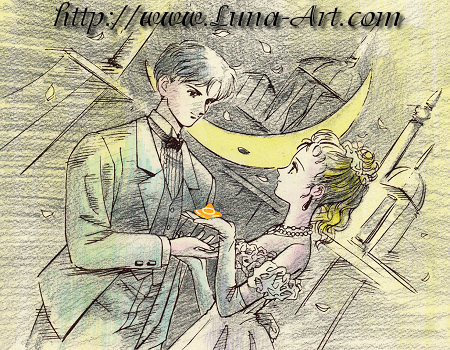 Yumeno Yumemi spots Usagi and Mamoru on the street and begs them to be models for her next illustration. Both Usagi and Mamoru reluctantly agree. While modeling, the two begin to bicker and Usagi gets upset with Mamoru over a comment he makes about Yumemi. Usagi spots a particularly beautiful picture of a girl giving her lover a small pendant as proof of her love and shows it to Mamoru to prove that Yumemi draws wonderful pictures. Mamoru gasps out in surprise, as if the scene in the picture is familiar to him. He imagines the gift the girl is giving to the boy is the Star Locket instead of the pendant. What a tender moment and expression of love between a prince and his princess. This cel is a great illustration of the fairly heavy foreshadowing in this episode of revelations to come in future episodes. I love the all the special details in this harmony cel: the huge crescent moon, the castle in the background, the subtle hints of color here and there. It really is a stunning and romantic piece!
