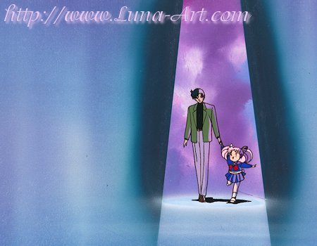 Wiseman tries to trick Sailor Moon with lies about Tuxedo Mask/Mamoru. He tries to convince her that Mamoru has bound his heart solely with Chibi Usa and that he has no room left for Usagi, therefore she has been discarded. While he is talking, scenes of Mamoru and Chibi Usa are shown, including this one where Mamoru is happily walking hand-in-hand with Chibi Usa.