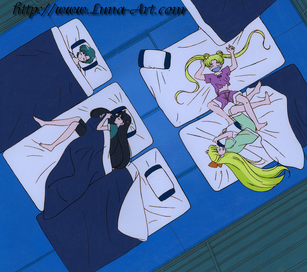 Makoto goes to a mountain temple to train to become more powerful. The girls go to visit Makoto and help with her training. They decide to sleepover at the temple. After a late night pillow fight, the girls fall asleep. In typical fashion, Ami sleeps in a perfect position, Rei and Minako are slightly messy and Usagi is a very messy sleeper.