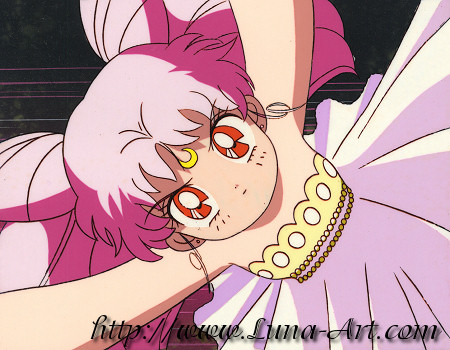 Neo-Queen Serenity and Small Lady combine the power of the two ginzuishous to defeat the Death Phantom, Wiseman. They demand, "Evil power! Be gone from this place!" Nice companion cel to my Neo-Queen Serenity.