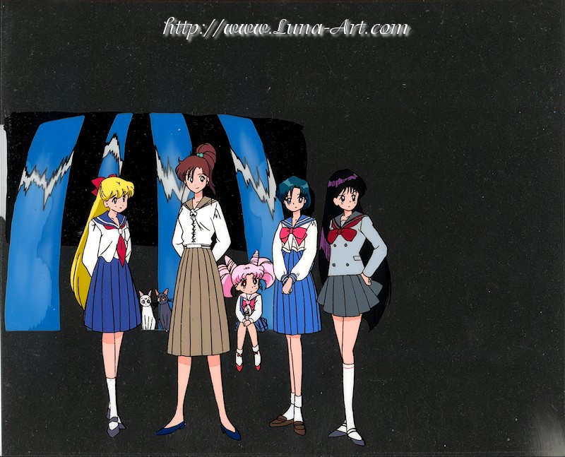 Minako, Makoto, Ami and Rei in their junior high fukus with Chibi Usa holding Diana, Luna and Artemis. They are standing in front of a fountain (the odd blue water behind them) as Usagi runs up to them. This cel come from the SEGA Saturn game: Bishoujo Senshi Sailor Moon Super S: Various Emotion.