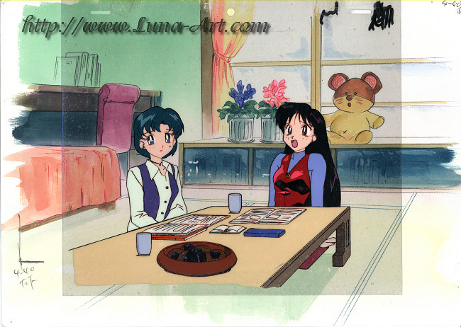 Ami and Rei look on as Minako, Usagi and Makoto discuss taking Chibi Usa to the Juuban Shizenkouen park where they are shooting a movie featuring the handsome film star, Eda Yousaku. Usagi insists that Rei go with them and Rei pretends to reluctantly agree. Very cute background!
